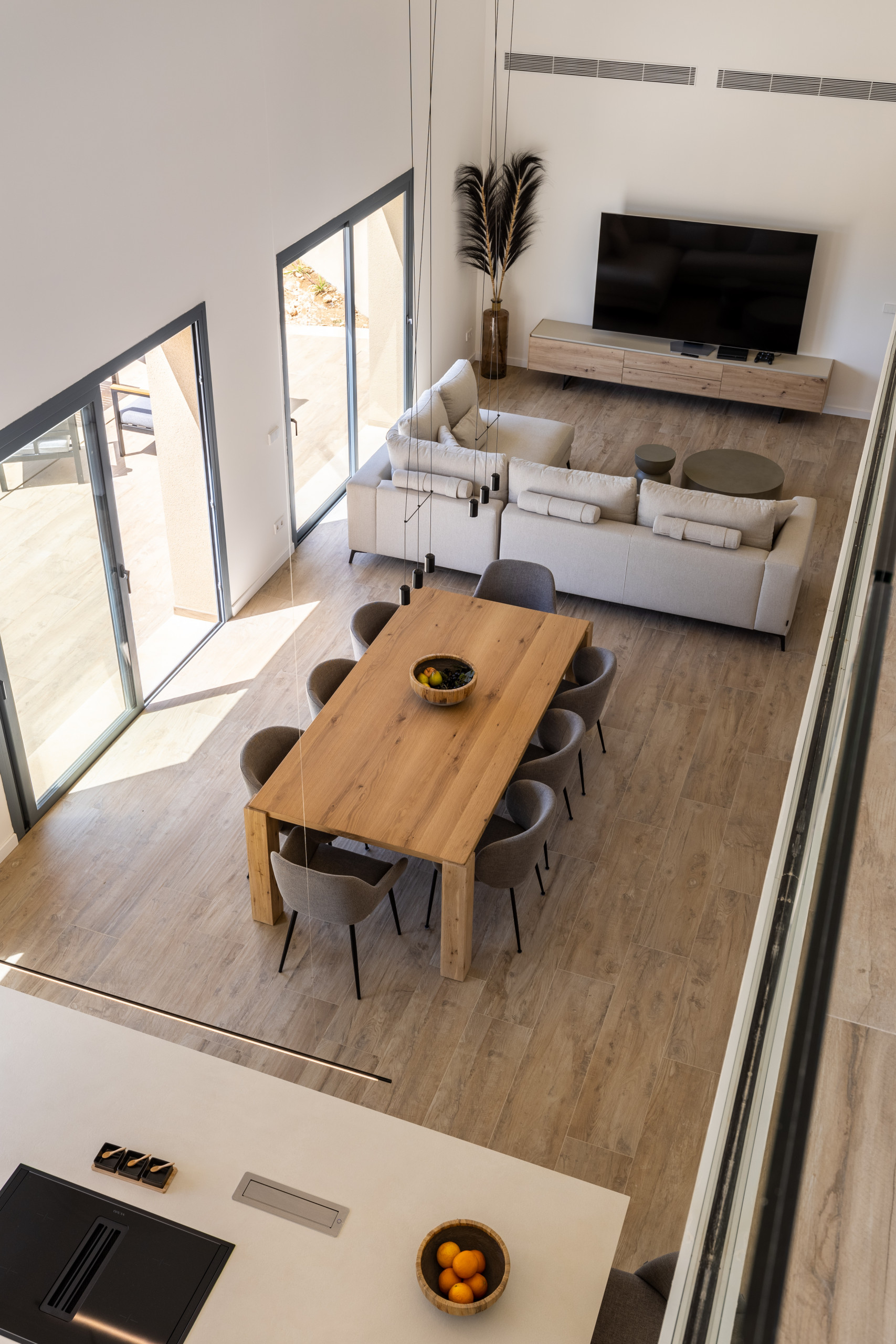La villa cuenta con 4 dormitorios y 6 baños, con una distribución que incluye 2 camas de matrimonio y 4 camas individuales, acomodando cómodamente hasta 8 huéspedes. La cocina americana, totalmente equipada con electrodomésticos de última generación como nevera, congelador, lavavajillas, horno, microondas y cafetera, permite a los huéspedes preparar deliciosas comidas durante su estancia.